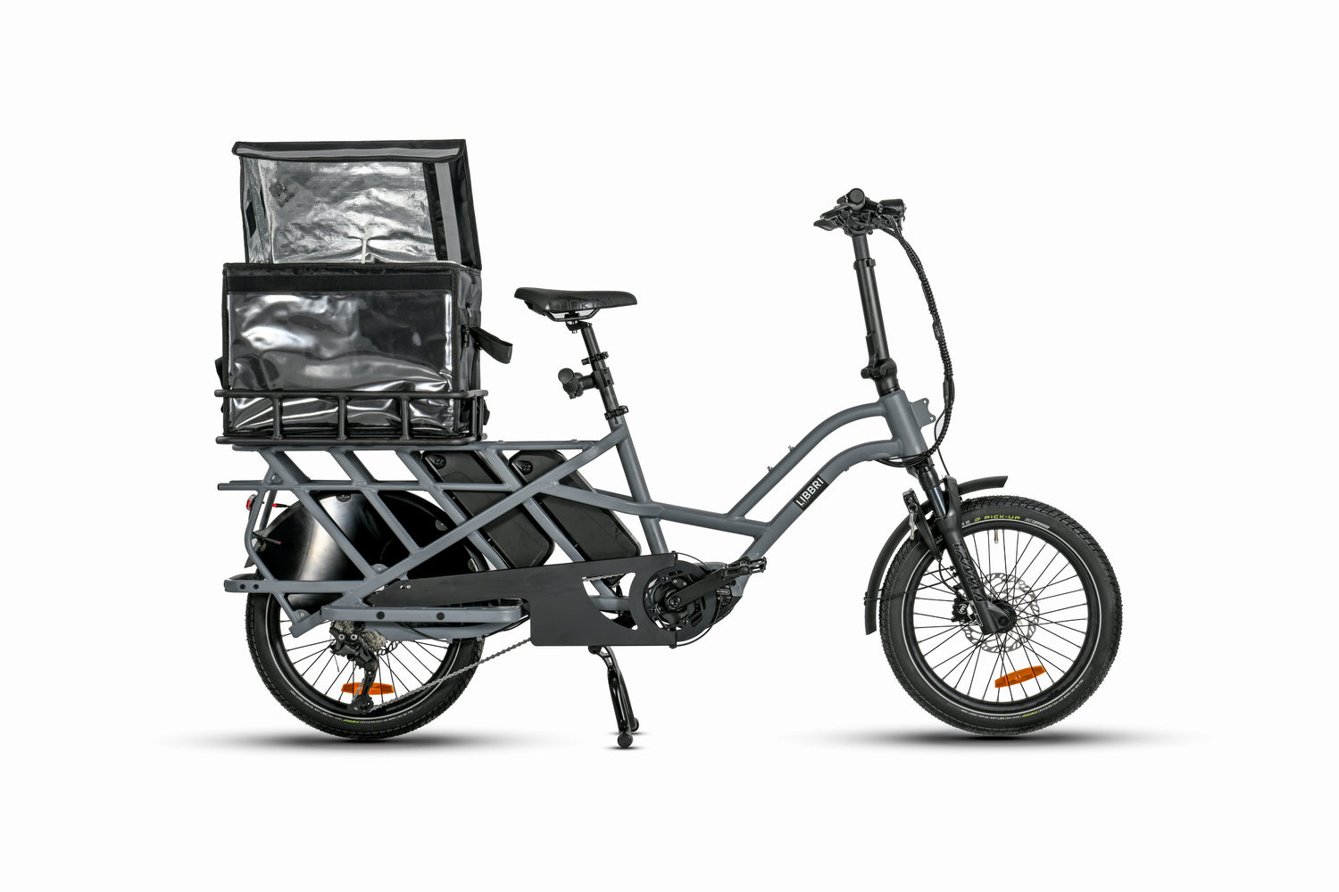 Ein Velo, das so vielseitig einsetzbar ist, braucht leistungsstarke Bremsen, und diese Bremsen erfüllen diese Anforderungen. Sie können ein voll beladenes Libbri schnell und sicher zum Stehen bringen. Die 20-Zoll-Räder sind mit pannensicheren Schwalbe Pick-Up 27,5x35-Reifen ausgestattet. Sie sind komfortabel und langlebig und verhindern, dass Sie in den Tramschienen stecken bleiben.
