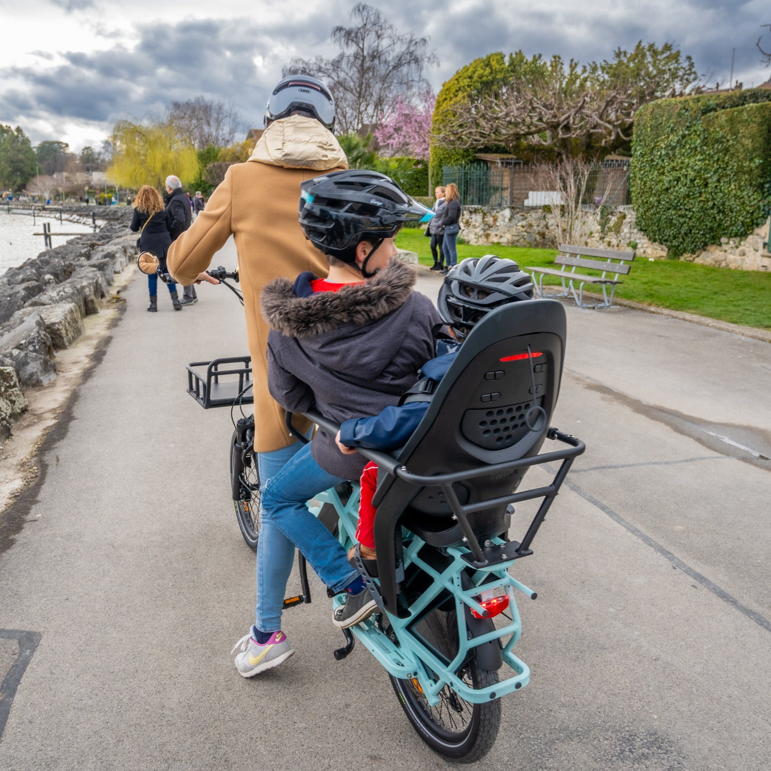 Auf dem Gepäckträger des Libbri Cargobike können zwei Kinder oder ein Erwachsener sicher transportiert werden. Der Speichenschutz verhindert jeglichen unbeabsichtigten Kontakt mit den Speichen. Der niedrige Schwerpunkt bietet Groß und Klein ein sicheres und bequemes Ein- und Absteigen.